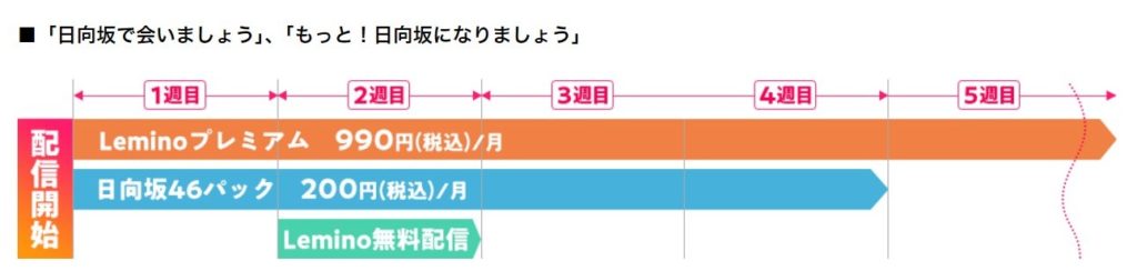 Leminoは無料で視聴可能ですが、無料で視聴できるのは最新回から1個前の回のみとなっております。つまりは、放送後1週間後から2週間後(2週目)のみ無料で視聴可能ということになります。なお、下記画像は配信期間のプランの違いです。ひなあいの過去回を見たい場合はLeminoのプレミアム会員or日向坂46パックに加入する必要があります(有料・後述)。