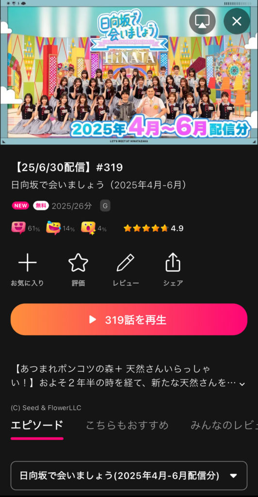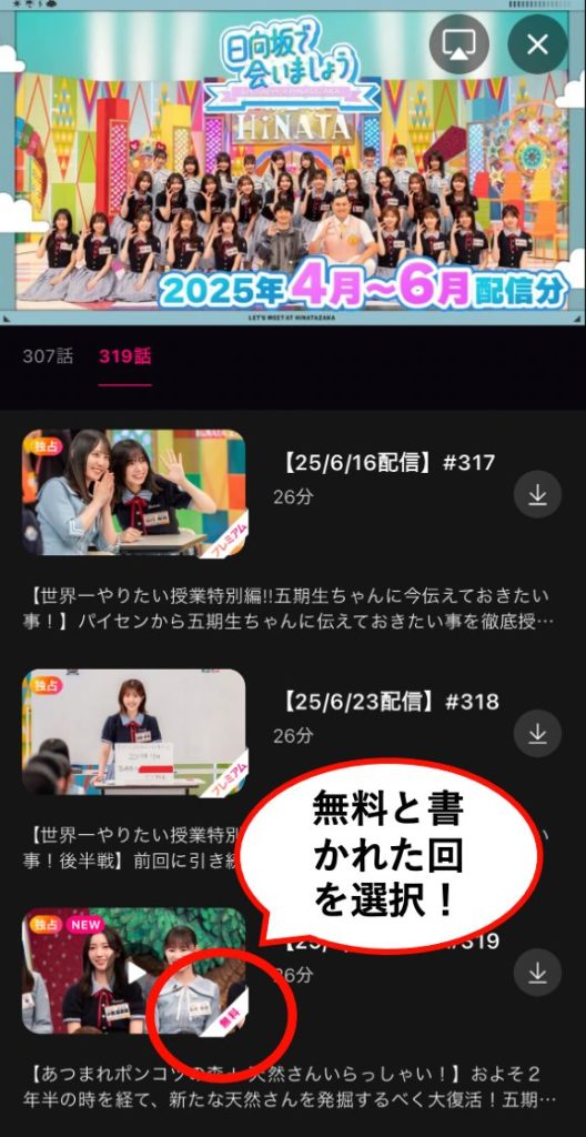 - 日向坂46パック(月額200円)で見逃し配信を見れるのは最新4話のみ(広告なし)